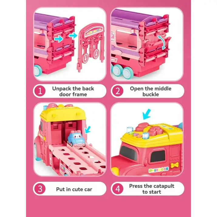 Answer 3: The product is available in both a battery version, which includes a princess catapult car and six cars, as well as a rechargeable version that also comes with the same components.